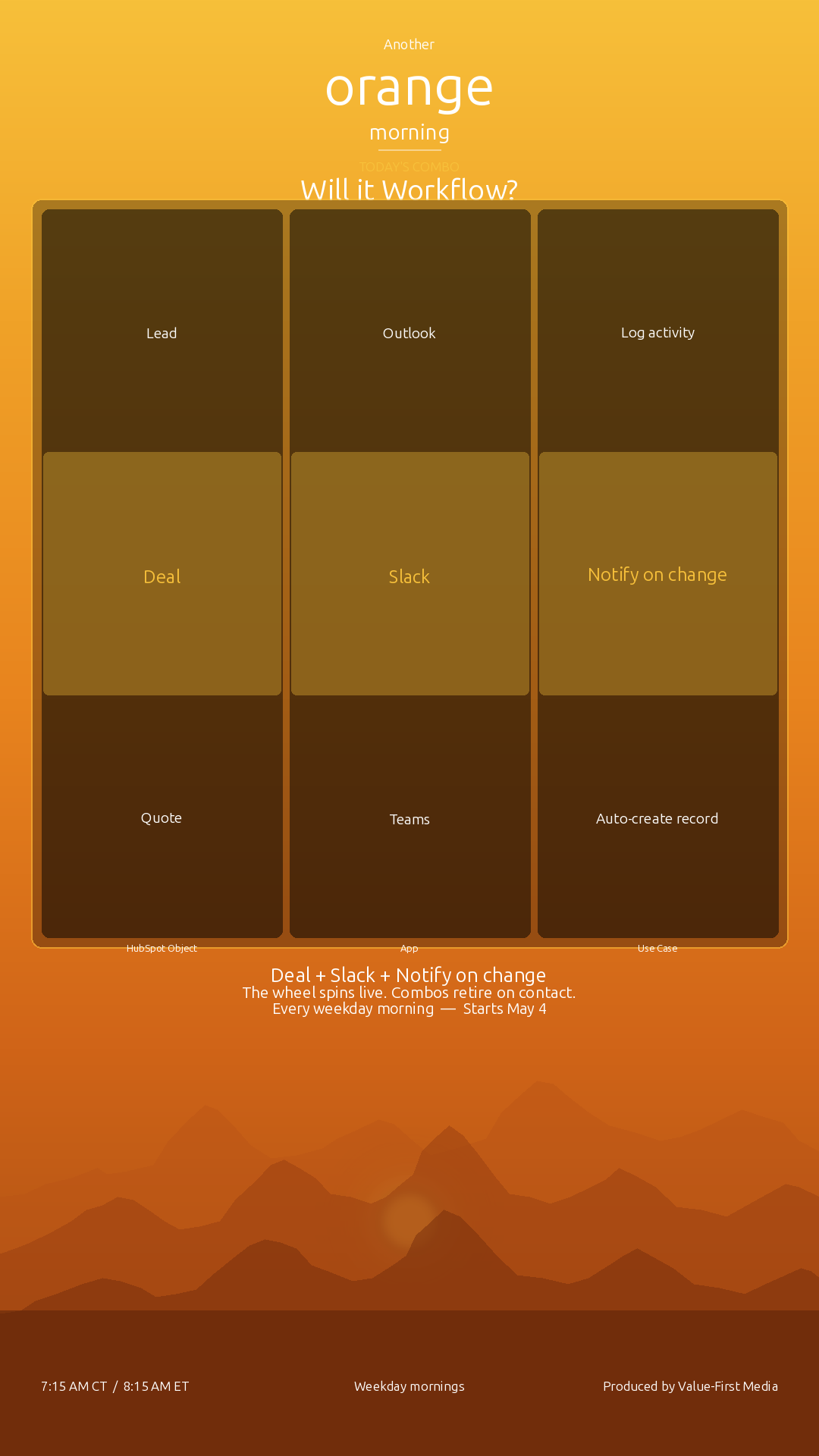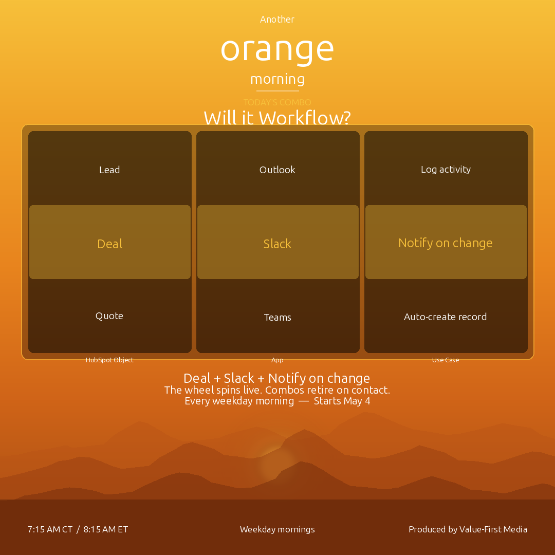 The hour is 7:00 to 8:00 AM Central, and only forty-five minutes of it is broadcast. The first fifteen are the production huddle β we triage yesterday's HubSpot release feed, lock the day's three to five updates, pick an Object of the Day, confirm whoever's joining us. The wheel does not spin in the huddle. The wheel spins live.